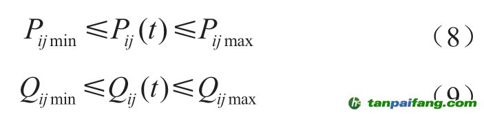 式中:Pijmin和Pijmax分別為節(jié)點(diǎn)i和節(jié)點(diǎn) j間輸電線路潮流有功功率的下限和上限;Qijmin和Qijmax分別為節(jié)點(diǎn)i和節(jié)點(diǎn)j間輸電線路潮流無(wú)功功率的下限和上限;Pij(t)和Qij(t)為節(jié)點(diǎn)i和節(jié)點(diǎn) j間輸電線路的實(shí)際潮流有功功率和無(wú)功功率。 夲呅內(nèi)傛萊源亍:ф啯碳*排*放^鮫*易-網(wǎng) τā ńpāīfāńɡ.cōm