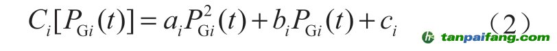 式中:F為系統(tǒng)運(yùn)行成本;T為調(diào)度時(shí)間段數(shù);n為發(fā)電機(jī)組個(gè)數(shù);PGi(t)為機(jī)組i在時(shí)間t的有功功率;Ci[PGi(t)]為機(jī)組i在時(shí)間t的運(yùn)行成本函數(shù),其公式為
