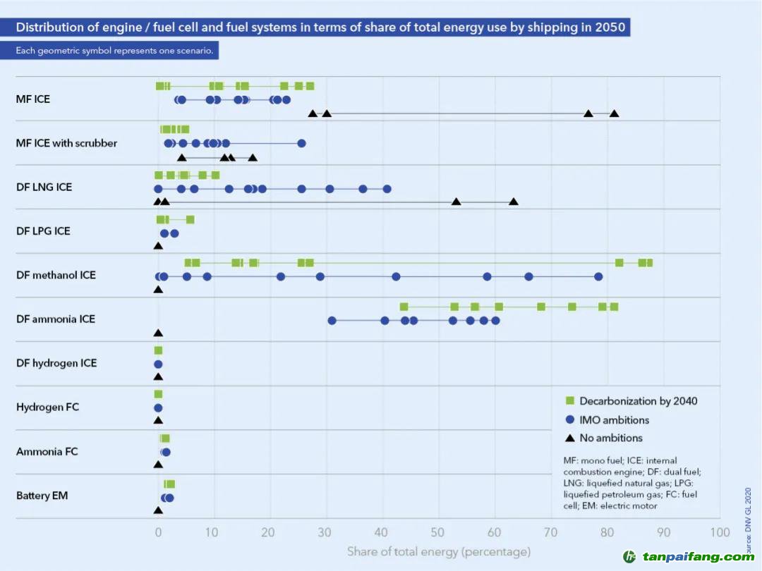 在2040年前的脫碳場景中,船隊不再使用液化天然氣過渡,而是直接使用碳中和燃料的甲醇或氨,用生物柴油和電化柴油作為現(xiàn)有船只的替代燃料。Longva指出:“在所有情況下,很難在許多不同的燃料選擇中找到明確的贏家。然而,在脫碳場景中,電化氨、藍(lán)氨和生物甲醇經(jīng)常占據(jù)較高的市場份額,從長遠(yuǎn)來看,它們是最有前途的碳中和燃料。”