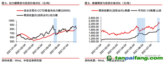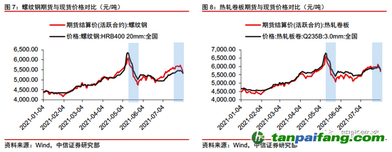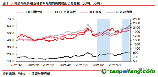 分析現(xiàn)貨和期貨兩個市場的價格走勢,其中煤炭價格分化顯著,或表明期貨市場投機性活動增多,而鋼材價格在兩個市場的走勢較為一致。對比煤炭現(xiàn)期貨市場價格走勢,有兩個時間段值得注意:(1)2021年5月,國常會自5月以來多次提及大宗商品漲價以及保供穩(wěn)價,煤炭及鋼材的期貨、現(xiàn)貨市場均出現(xiàn)回調(diào),其中動力煤和焦煤的期貨和現(xiàn)貨價格回調(diào)幅度分化顯著,期貨市場價格降幅明顯,而現(xiàn)貨市場價格回調(diào)幅度有限;(2)2021年7月30日及之后,政治局會議提及“減碳”相關(guān)內(nèi)容后,市場對于限產(chǎn)預期有所松動,多個大宗商品期貨價格下跌,投機性資金被震出,期市多頭情緒有所降溫。煤炭現(xiàn)貨市場維持韌性,供需缺口存在下未出現(xiàn)明顯回落。 本*文@內(nèi)-容-來-自;中_國_碳^排-放*交-易^網(wǎng) t an pa i fa ng . c om