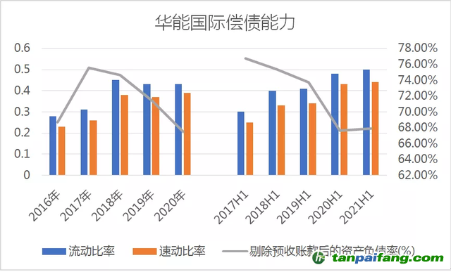 從公司半年報來看,2017年至2021年上半年,流動比率分別為0.30、0.40、0.41、0.48、0.50;速動比率分別為0.25、0.33、0.34、0.43、0.44;剔除預(yù)收賬款后的資產(chǎn)負(fù)債率分別為76.74%、75.37%、73.74%、67.63%、67.91%,2021年上半年較2020年同期增長0.28%。 禸*嫆唻@洎:狆國湠棑倣茭昜蛧 τāńpāīfāńɡ.cōm