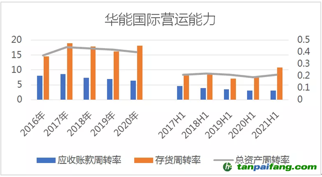 從公司半年報來看,2017年至2021年上半年,存貨周轉(zhuǎn)率分別為8.28、8.76、7.04、7.51、10.79,2021年上半年較2020年同期上升。應(yīng)收賬款周轉(zhuǎn)率分別為4.59、3.85、3.48、3.07、3.09;總資產(chǎn)周轉(zhuǎn)率分別為0.21、0.22、0.21、0.19、0.21。