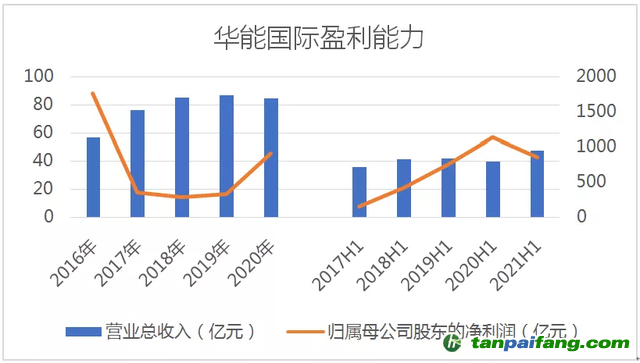 從盈利能力來看,2016-2020年,華能國際的營業(yè)總收入分別為1138.14億元、1524.59億元、1698.61億元、1734.85億元、1694.39億元,整體呈逐年上升趨勢,2020年營業(yè)總收入與2019年相比稍微下降。歸屬母公司股東的凈利潤分別為88.14億元、17.93億元、14.39億元、16.86億元、45.65億元,2018年之后呈逐年上升趨勢。