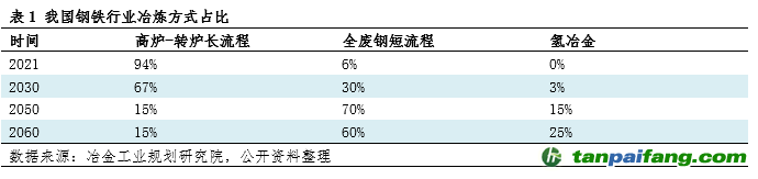 而冶煉方式的轉(zhuǎn)變具體分為兩種方式:一種是由目前的高爐-轉(zhuǎn)爐的長流程煉鋼轉(zhuǎn)向全廢鋼電爐的短流程煉鋼,另一種是利用氫冶金技術(shù)代替碳冶金技術(shù)。根據(jù)表1中冶金工業(yè)規(guī)劃研究院的數(shù)據(jù)顯示目前我國的鋼鐵生產(chǎn)中有94%是通過長流程完成的,僅有6%通過短流程完成。當(dāng)?shù)?030的時候,我國鋼鐵鋼業(yè)已經(jīng)實現(xiàn)“碳達(dá)峰”目標(biāo),此時我國的鋼鐵生產(chǎn)有67%是通過長流程完成,30%通過短流程完成,3%通過氫冶金完成。當(dāng)?shù)?050年的時候,我國距離實現(xiàn)“碳中和”目標(biāo)還差最后十年,此時我國的鋼鐵生產(chǎn)有15%通過長流程完成,70%通過短流程完成,15%通過氫冶金完成。當(dāng)?shù)?060年的時候,我國已經(jīng)實現(xiàn)“碳中和”目標(biāo),此時我國的鋼鐵生產(chǎn)有15%通過長流程完成,但是由于我國鋼鐵總產(chǎn)量的下降使得廢鋼資源有所減少,因此60%通過短流程完成,剩下25%的產(chǎn)量則通過氫冶金完成。 本/文-內(nèi)/容/來/自:中-國-碳-排-放-網(wǎng)-tan pai fang . com