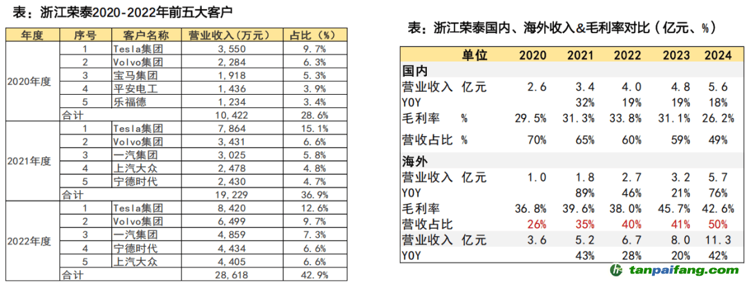浙江榮泰:特斯拉、大眾等海外頭部車企一級供應(yīng)商;2024年海外營收同增76%,毛利率42.6%高于國內(nèi),利潤有望隨海外客戶占比提升增長。