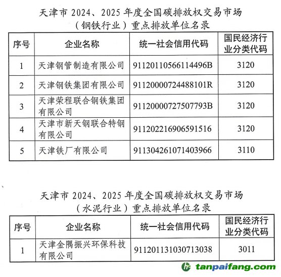 天津市2024、2025年度全國碳排放權(quán)交易市場鋼鐵、水泥和鋁冶煉行業(yè)重點排放單位名錄公示