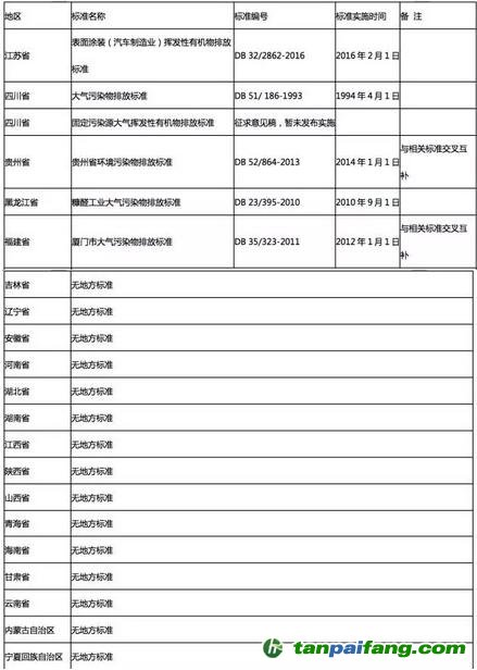 截止2016年12月31日全國各地陸續(xù)公布VOCs最新排放標(biāo)準(zhǔn)的正式發(fā)布稿和征求意見稿。征求意見稿雖然還未正式發(fā)布,但是對17年的工作有很大的指導(dǎo)意義。 禸嫆@唻洎:狆國湠棑倣茭昜蛧 τāńpāīfāńɡ.cōm