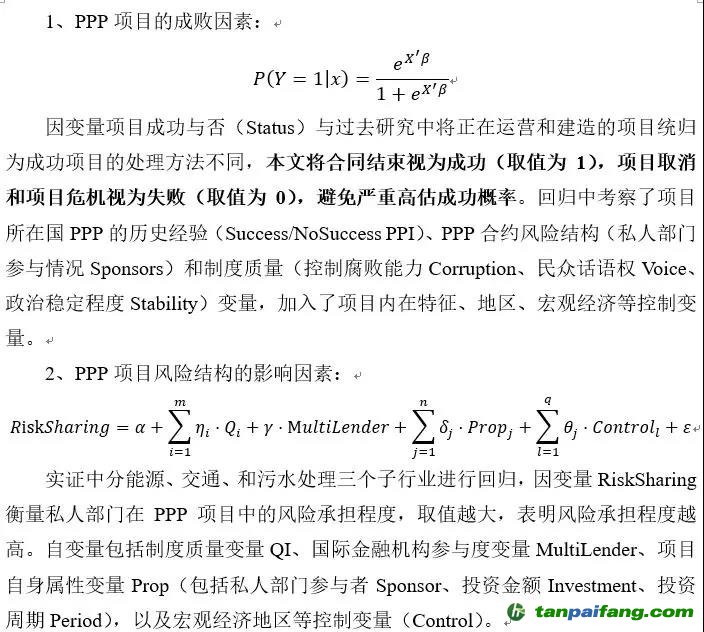 PPP作為政府部門和私人企業(yè)合作以及分擔(dān)風(fēng)險和共享收益的契約安排,風(fēng)險分擔(dān)分擔(dān)結(jié)構(gòu)不同導(dǎo)致了私人參與程度的差異。影響PPP項目運作的成效的因素可歸納為:1、項目所在地PPP成功運作的經(jīng)驗會提升后續(xù)項目的成功概率;2、風(fēng)險結(jié)構(gòu)、私人投資者的數(shù)量、投資金額、周期等項目內(nèi)生特征,在一定程度上可控;3、法治水平、政治穩(wěn)定度、政府效率、對私人部門管制程度等制度質(zhì)量越高,私人部門的參與程度越高;4、外部融資渠道會產(chǎn)生差異化影響,非營利性國際金融機構(gòu)較私人銀行融資更易提高項目成功概率;5、宏觀經(jīng)濟條件好、開放程度高有利于促進私人部門投資。