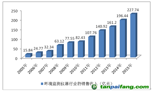 中國環(huán)境監(jiān)測儀器行業(yè)的銷售收入逐年增加,由2005年的15.84億元上升為2015年的227.74億元。近幾年我國環(huán)境監(jiān)測儀器行業(yè)的銷售收入情況如下圖所示: