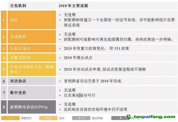 下表中總結(jié)了2018年各交易機(jī)制的重要變化。有關(guān)各機(jī)制的具體信息,請參閱《2017年度報(bào)告:企業(yè)可再生能源采購在中國的市場現(xiàn)狀》。