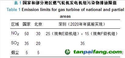 為規(guī)范燃氣輪機發(fā)電機組污染物排放水平,2011年中國發(fā)布了《火電廠大氣污染物排放標準GB13223—2011》(以下簡稱為國家標準),隨后部分經(jīng)濟發(fā)達地區(qū)也相繼發(fā)布地方標準或出臺政策。2011年年底北京發(fā)布《固定式燃氣輪機大氣污染物排放標準DB11847—2011》;2017年深圳市人民政府發(fā)布1號文《深圳市大氣環(huán)境質(zhì)量提升計劃(2017—2020年)》,進一步降低燃氣輪機發(fā)電機組NOx排放限值,具體情況如表1所示。 本`文@內(nèi)/容/來/自:中-國^碳-排-放^*交*易^網(wǎng)-tan pai fang. com