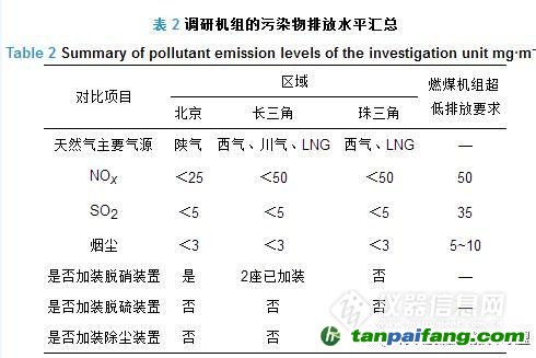 由于國家標(biāo)準(zhǔn)中關(guān)于燃?xì)廨啓C(jī)發(fā)電機(jī)組的SO2和煙塵的排放限值遠(yuǎn)高于實(shí)際排放水平,所以為了解相關(guān)標(biāo)準(zhǔn)實(shí)施后的實(shí)際排放水平,本文采用實(shí)地交流和發(fā)放問卷方式對中國典型地區(qū)的燃?xì)怆姀S進(jìn)行了環(huán)?,F(xiàn)狀調(diào)研,主要污染物排放水平匯總?cè)绫?所示。