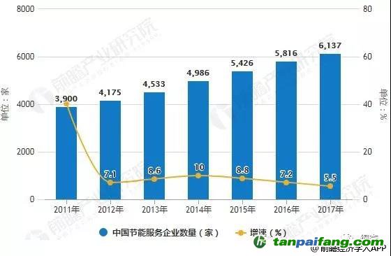 2011-2017年中國(guó)節(jié)能服務(wù)企業(yè)數(shù)量統(tǒng)計(jì)及增長(zhǎng)情況