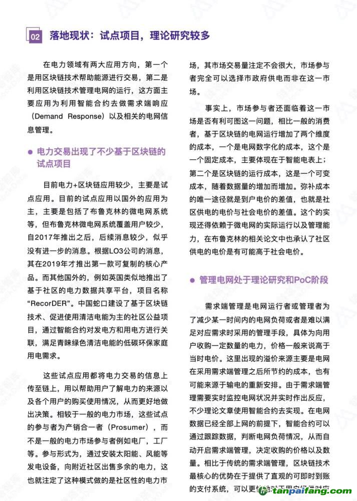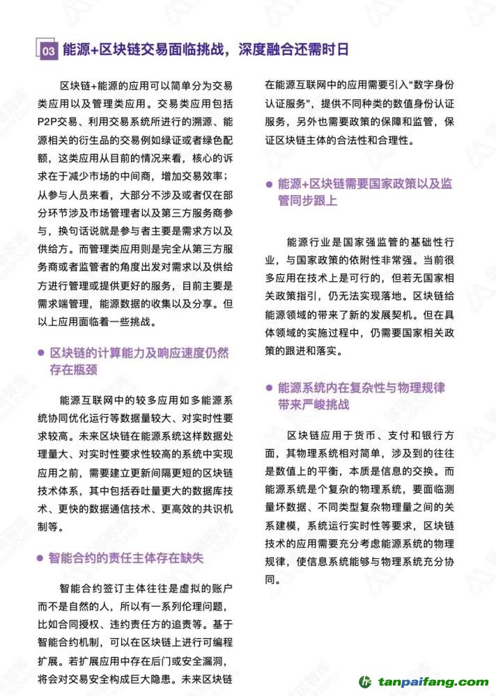 鏈塔智庫(kù)認(rèn)為能源+區(qū)塊鏈目前試點(diǎn)應(yīng)用較多,但集中在能源交易,溯源等應(yīng)用,并沒(méi)有與能源進(jìn)行深度融合。而阻攔與行業(yè)深度融合的因素有:能源產(chǎn)業(yè)鏈的數(shù)字化程度不高、區(qū)塊鏈自身的技術(shù)缺陷、未來(lái)可能的監(jiān)管政策變化以及能源產(chǎn)業(yè)鏈自身的復(fù)雜性。 本/文-內(nèi)/容/來(lái)/自:中-國(guó)-碳-排-放-網(wǎng)-tan pai fang . com