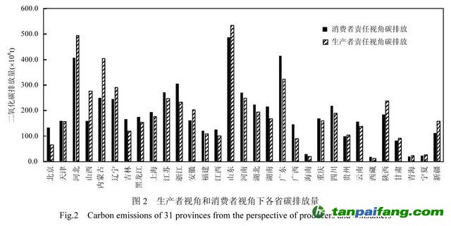 生產(chǎn)者視角和消費者視角下各省碳排放量 資料來源:中國環(huán)境科學(xué)2020年12期 本@文$內(nèi).容.來.自:中`國`碳`排*放^交*易^網(wǎng) t a np ai fan g.c om