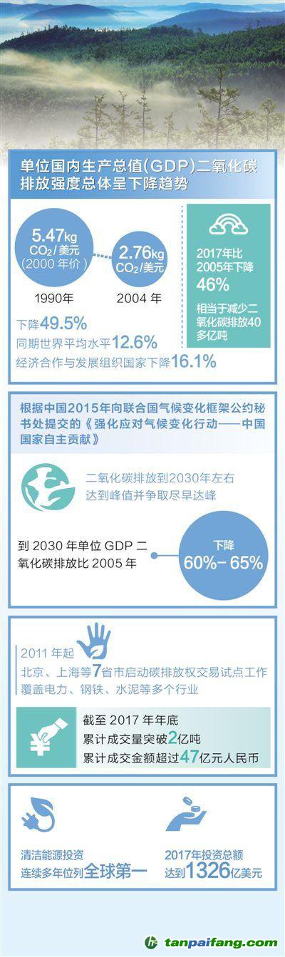 “十二五”時期,我國單位GDP二氧化碳排放量累計下降20%左右,超額完成先前確定的17%的目標。根據(jù)“十三五”規(guī)劃綱要,我國要在“十三五”期間實現(xiàn)單位GDP二氧化碳排放量累計下降18%這一約束性指標。而2017年,我國單位GDP二氧化碳排放比2005年下降了46%,相當于減少二氧化碳排放40多億噸,已經(jīng)超過對外承諾的到2020年碳強度下降40%—45%的上限目標。