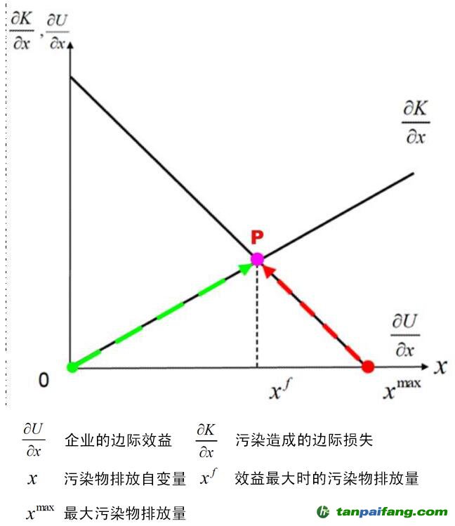 綠色虛線下方的面積表示當(dāng)產(chǎn)權(quán)歸給居民時(shí),鋼鐵廠需要付給居民的賠償費(fèi),這筆錢(qián)比鋼鐵廠的利潤(rùn)要少,此時(shí)鋼鐵廠樂(lè)于付出賠償費(fèi),來(lái)保證自己的產(chǎn)量。到達(dá)p點(diǎn)時(shí),鋼鐵廠繼續(xù)排放更多污染物所帶來(lái)的收益不及自己要付給居民的賠償費(fèi),鋼鐵廠自然而然地不會(huì)繼續(xù)排放污染物,這是常規(guī)的污染方來(lái)負(fù)責(zé)的原則。紅色虛線下方的面積表示當(dāng)產(chǎn)權(quán)歸給鋼鐵廠時(shí),居民為了不造成太嚴(yán)重的健康損失,而付給鋼鐵廠的錢(qián),以此來(lái)代替鋼鐵廠的利潤(rùn),從而說(shuō)服鋼鐵廠不再排放更多的污染物。這筆錢(qián)比健康損失成本要少,居民也愿意付出。但當(dāng)居民付出的錢(qián)到達(dá)p點(diǎn)時(shí),會(huì)發(fā)現(xiàn)繼續(xù)付給鋼鐵廠更多的錢(qián)比自己付出些健康成本要高,這時(shí)就不劃算了,因此居民也不會(huì)再支付更多錢(qián)來(lái)讓鋼鐵廠減排。因此無(wú)論產(chǎn)權(quán)歸誰(shuí),經(jīng)過(guò)雙方談判協(xié)商后達(dá)成交易的鋼產(chǎn)量和污染排放量都會(huì)平衡在p點(diǎn)。