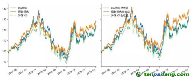 圖 3 中證-中財(cái)滬深100 ESG領(lǐng)先指數(shù)、滬深300綠色領(lǐng)先股票指數(shù)收益對(duì)比圖