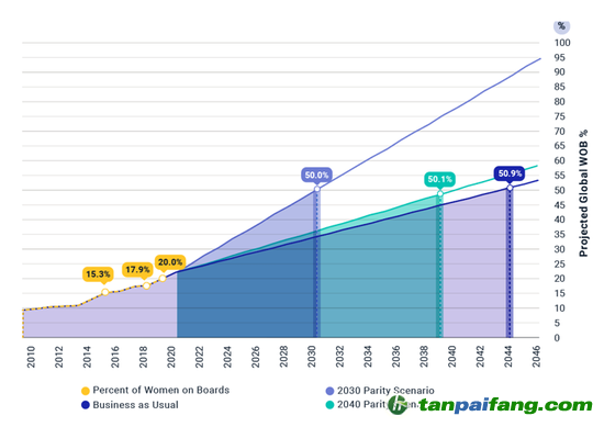 2016年至2019年(截至2019年10月31日),MSCI ACWI全球指數(shù)成份股公司董事會(huì)中的女性比例平均同比增長(zhǎng)1.2%。延續(xù)現(xiàn)狀的情景,假設(shè)未來(lái)幾十年將延續(xù)同樣的增速。如果2040年實(shí)現(xiàn)性別平等,每年需增長(zhǎng)1.4%(2040年實(shí)現(xiàn)性別平等情景),如果2030年實(shí)現(xiàn)性別平等,每年需增長(zhǎng)2.8%(2030年實(shí)現(xiàn)性別平等情景)。
