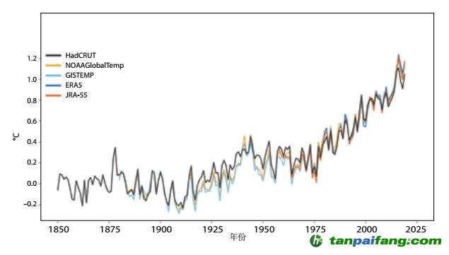 感受一波不同資料集所描繪的全球平均溫度異常