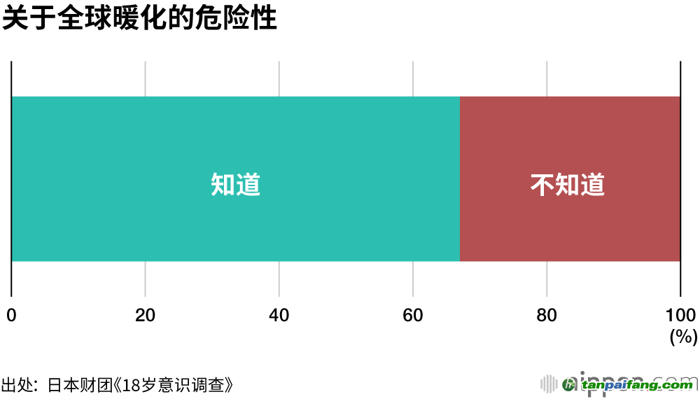 臺(tái)風(fēng)和暴雨令災(zāi)害進(jìn)一步加劇、海水溫度上升對(duì)水產(chǎn)資源帶來重大影響等,與“全球暖化”相關(guān)的新聞,頻繁地出現(xiàn)在報(bào)紙和電視上。但是,日本財(cái)團(tuán)實(shí)施的有關(guān)氣候變化的《18歲意識(shí)調(diào)查》卻顯示,對(duì)人類面臨的“全球暖化”的風(fēng)險(xiǎn),67%的人回答“知道”,而回答“不知道”者占到33%,是整體的三分之一。