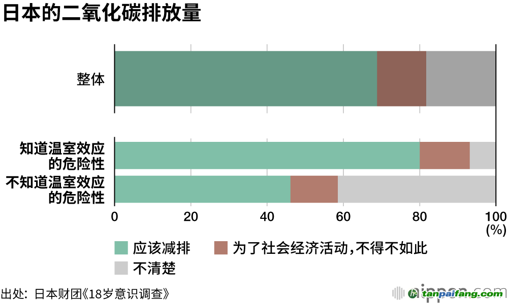 針對(duì)日本二氧化碳排放量位居全球第五這一現(xiàn)實(shí),68.8%回答“應(yīng)該減排”,認(rèn)為“為了社會(huì)經(jīng)濟(jì)活動(dòng),不得不如此”的只有12.9%。在“知道全球暖化的危險(xiǎn)性”的受訪者中,有80%的人認(rèn)為“應(yīng)該減排”;而“不知道溫室效應(yīng)的危險(xiǎn)性” 的受訪者中,認(rèn)為“應(yīng)該減排”為46.1%,還不到半數(shù),另有41.5%的人表示“不知道該怎么辦”。 內(nèi)/容/來/自:中-國-碳-排-放*交…易-網(wǎng)-tan pai fang . com