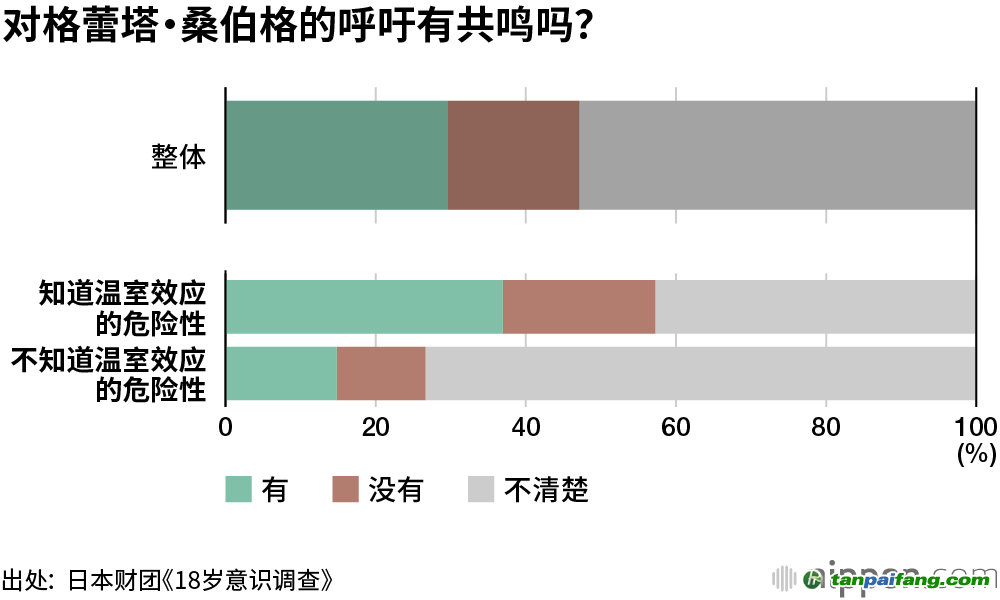 2019年9月,瑞典環(huán)保活動(dòng)人士格蕾塔·桑伯格在聯(lián)合國氣候行動(dòng)峰會(huì)上呼吁阻止全球氣候變暖,世界各國年輕人舉行了罷課等抗議活動(dòng)。對(duì)此,只有29.6%的受訪者表示“贊同”;在“不知道全球變暖危險(xiǎn)性”的受訪者中,表示“同意”(14.8%)和“不同意”(11.8%)的人數(shù)都很少,絕大多數(shù)選擇了“不清楚”(72.5%)。 內(nèi).容.來.自:中`國`碳#排*放*交*易^網(wǎng) t a np ai f an g.com
