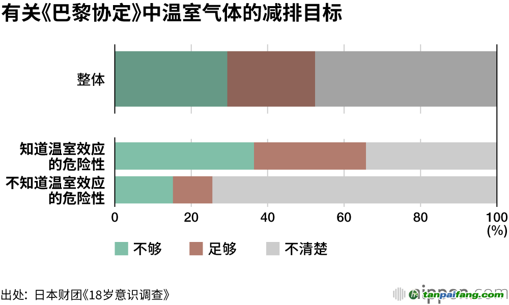 在應(yīng)對(duì)全球氣候變暖的國際框架《巴黎協(xié)定》中,日本打出了2030年度的溫室氣體排放量比2013年度減少26%的中期目標(biāo)。針對(duì)這個(gè)目標(biāo)“與其他國家相比是否足夠”這一問題,近半數(shù)受訪者,即47.6%的人回答“不清楚”,特別是在“不知道全球暖化危險(xiǎn)性”的受訪者中,這一比例更是高達(dá)75.4%。