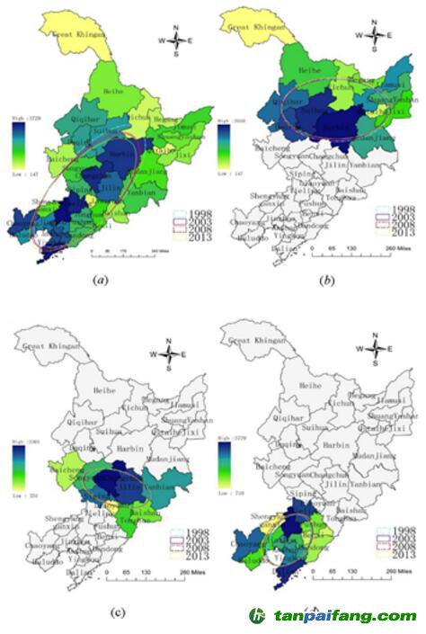 基于這種方法,本文對1998年至2013年中國東北三個省份進(jìn)行了碳排放熱點(diǎn)分析和標(biāo)準(zhǔn)偏差橢圓分析。結(jié)果表明,中國東北地區(qū)的總碳排放量呈現(xiàn)出持續(xù)增長的趨勢,并且不同地區(qū)的增長速度存在差異。而且,碳排放的空間集聚正在增加,東部沿海城市顯示出熱點(diǎn)逐漸擴(kuò)大的模式,而北部地區(qū)的城市逐漸轉(zhuǎn)變?yōu)槔潼c(diǎn)。中國東北的碳排放軸位于西南-東北方向,并呈向東旋轉(zhuǎn)的趨勢;東北三個省重心的經(jīng)度向西偏移,而緯度則減小。這一結(jié)果可以增進(jìn)決策者對中國東北三個省份碳排放時空特征的了解。