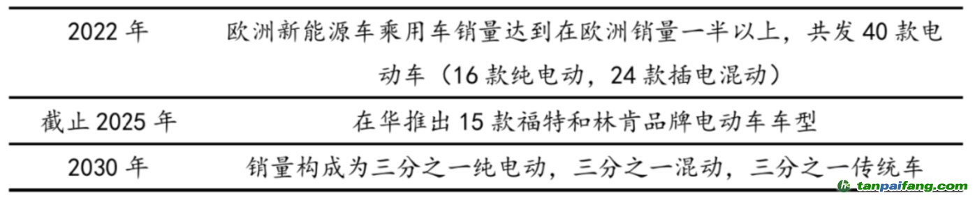 美系車企中,通用計劃在2020年前在中國至少推出10款新能源車,到2026年全球新能源車年銷量達到100萬輛;福特計劃在2022年在歐洲新能源乘用車銷量達到乘用車銷量一半以上,在2030年電動化汽車占比達到三分之二以上;特斯拉計劃在2020年達到年銷量。 本`文@內/容/來/自:中-國^碳-排-放^*交*易^網-tan pai fang. com