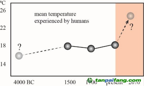 過去6000年來以及50年后全球平均人體環(huán)境溫度(年均溫),問號表示人口分布重建數(shù)據以及未來氣候模型具有不確定性。