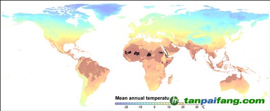 當前氣候條件下(背景為當前年均溫),年均溫在29攝氏度以上的區(qū)域(圖中黑色區(qū)域)主要集中在撒哈拉沙漠腹地。在RCP8.5氣候變化情景下,到2070年年均溫29度以上區(qū)域將大幅擴展(陰影區(qū)域)。
