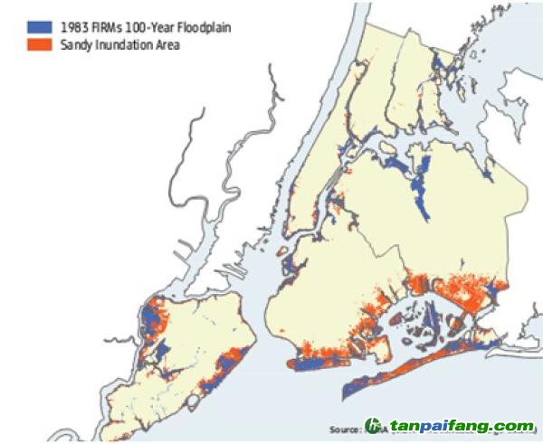圖1 美國(guó)聯(lián)邦應(yīng)急屬1983年發(fā)布的百年一遇洪水范圍與桑迪颶風(fēng)淹沒(méi)區(qū)域的比較(資料來(lái)源:鄭艷,推動(dòng)城市適應(yīng)規(guī)劃,構(gòu)建韌性城市——發(fā)達(dá)國(guó)家的案例與啟示) 內(nèi).容.來(lái).自:中`國(guó)`碳#排*放*交*易^網(wǎng) t a np ai f an g.com