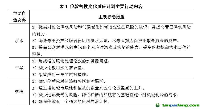 倫敦市遭受洪水、干旱和熱浪的風(fēng)險(xiǎn)較高,這些氣候事件對(duì)倫敦的健康、環(huán)境、經(jīng)濟(jì)和基礎(chǔ)設(shè)施等跨領(lǐng)域問(wèn)題都造成影響。因此,該《氣候變化適應(yīng)計(jì)劃》提出了34條應(yīng)對(duì)這些氣候事件和相關(guān)問(wèn)題的行動(dòng)。主要行動(dòng)措施如表1。 本文`內(nèi)-容-來(lái)-自;中_國(guó)_碳_交^易=網(wǎng) tan pa i fa ng . c om