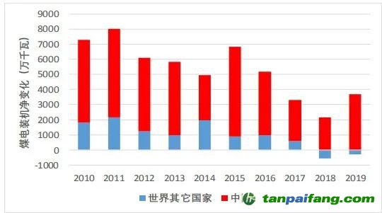 圖1 2010~2019年我國與全球其他國家凈新增煤電裝機情況 本`文@內(nèi)/容/來/自:中-國^碳-排-放^*交*易^網(wǎng)-tan pai fang. com