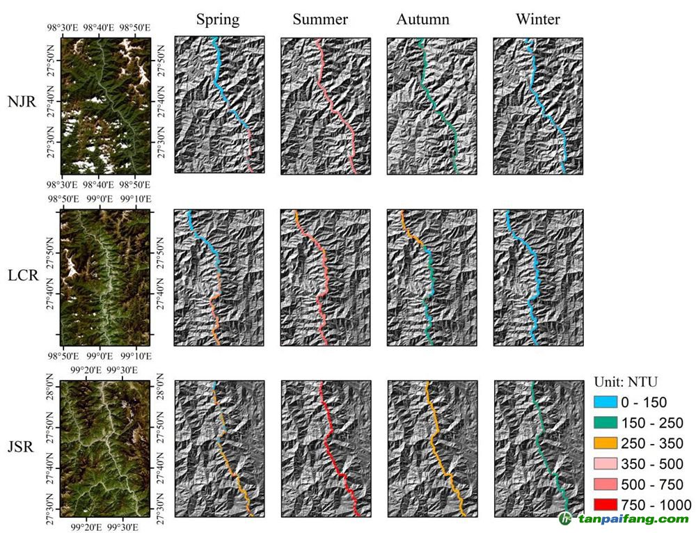 圖3. 三江并流區(qū)怒江(NJR)、瀾滄江(LCR)和金沙江(JSR)季節(jié)性水體渾濁度空間分布