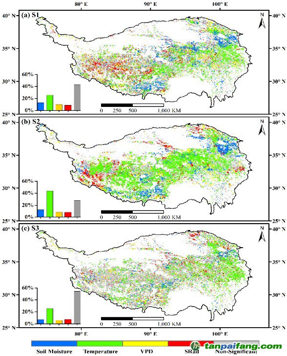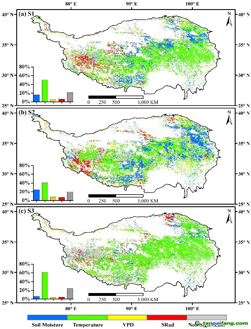 圖2. 高寒草甸不同生長階段(S1、S2和S3)GPP(A)和NEP(B)變化的主導(dǎo)氣候因素的空間分布