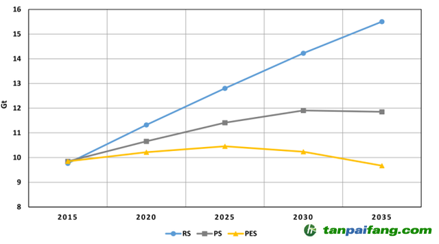 在國家層面,與基準情景相比,達峰情景將導致2030年二氧化碳排放量減少16%。在達峰情景下,2030-2035年間,二氧化碳排放量將穩(wěn)定在119億噸,而在提早達峰情景下,到2025年,二氧化碳排放量將達到105億噸左右的明顯峰值。碳排放減少反映了效率提高、燃料轉換和結構轉變的綜合效應。