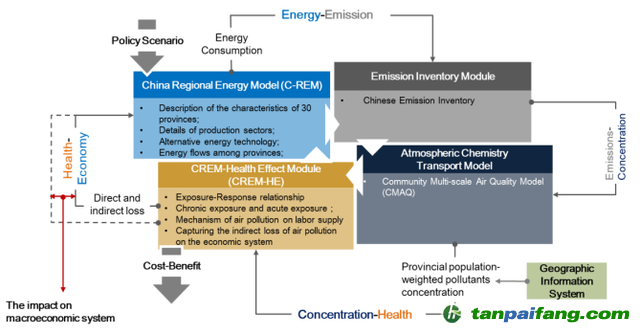 為了回答上述問題,本研究使用了REACH研究框架。該框架結合了中國區(qū)域能源模型(C-REM),中國排放清單,CMAQ,以及CREM健康效應(CREM-HE)模塊,從而達到實施跨學科和多系統(tǒng)集成評估的目的。REACH模型的主要結構如圖1所示。