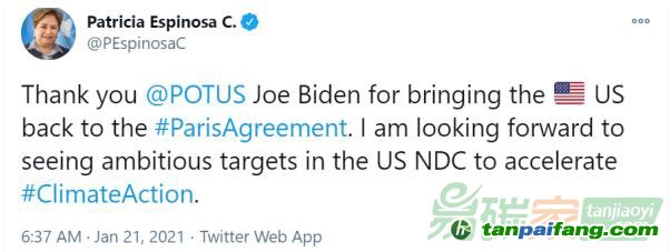 《聯(lián)合國(guó)氣候變化框架公約》執(zhí)行秘書(shū)Patricia Espinosa感謝美國(guó)總統(tǒng)喬·拜登使美國(guó)重返《巴黎協(xié)定》,她表示:“我期待看到美國(guó)國(guó)家自主貢獻(xiàn)(NDC)加快氣候行動(dòng)的雄心勃勃的目標(biāo)。”