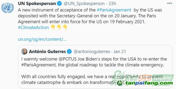 1月20日,美國(guó)向聯(lián)合國(guó)秘書(shū)長(zhǎng)交存了一份新的美國(guó)接受《巴黎協(xié)定》的文書(shū),表示同意接受該協(xié)定的約束。