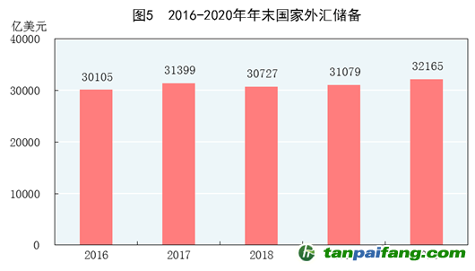 年末國(guó)家外匯儲(chǔ)備32165億美元,比上年末增加1086億美元。全年人民幣平均匯率為1美元兌6.8974元人民幣,比上年升值0.02%。