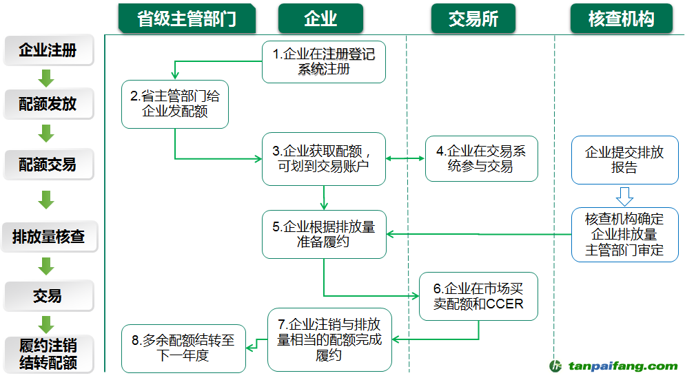 碳排放權(quán)交易涉及多個主體,包括政府主管部門、政府主管部門下設(shè)或外聘的核查機(jī)構(gòu)、交易機(jī)構(gòu)、控排主體(初期主要是重點(diǎn)排放單位),其中,政府主管部門(包括地方及國家主管部門)負(fù)責(zé)配額發(fā)放及核查審定;核查機(jī)構(gòu)負(fù)責(zé)審查交易項(xiàng)目及排放量;交易所負(fù)責(zé)制定交易規(guī)則,發(fā)布交易信息,統(tǒng)籌市場交易;控排企業(yè)則貫穿整個碳交易流程,根據(jù)國家及交易機(jī)構(gòu)制定的規(guī)則,完成碳交易周期履約工作。 內(nèi)-容-來-自;中_國_碳_0排放¥交-易=網(wǎng) t an pa i fa ng . c om