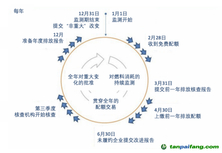歐盟碳市場年度履約周期示意圖[3] 本/文-內(nèi)/容/來/自:中-國-碳-排-放-網(wǎng)-tan pai fang . com