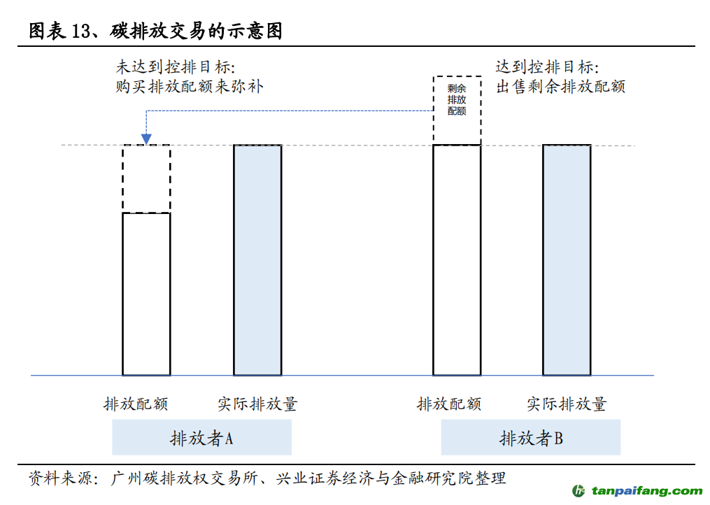 碳交易市場(chǎng)是由政府通過(guò)對(duì)能耗企業(yè)的控制排放而人為制造的市場(chǎng)。通常情況下,政府確定一個(gè)碳排放總額,并根據(jù)一定規(guī)則將碳排放配額分配至企業(yè)。如果未來(lái)企業(yè)排放高于配額,需要到市場(chǎng)上購(gòu)買(mǎi)配額。與此同時(shí),部分企業(yè)通過(guò)采用節(jié)能減排技術(shù),最終碳排放低于其獲得的配額,則可以通過(guò)碳交易市場(chǎng)出售多余配額。雙方一般通過(guò)碳排放交易所進(jìn)行交易。