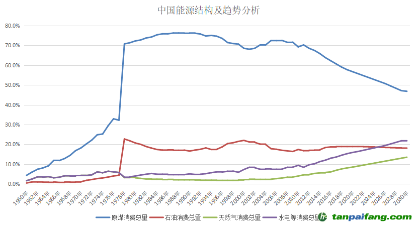 總的結(jié)構(gòu)中,煤炭的占比可能會從目前的57%下降10個百分點,石油消耗總量可能會下降不到1個百分點。而天然氣的消費量可能會從目前的8.3%提高5個百分點,以水電、核能、風能、太陽能和生物質(zhì)能為主的新能源占比可能會提高6個百分點。這樣看來,煤炭、石油天然氣為主的化石能源的占比雖從現(xiàn)在的85%下降到80%以下,但仍然占比較大。