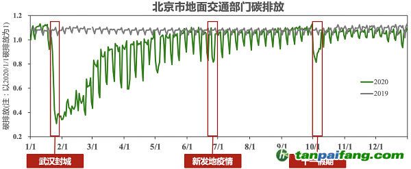 GRACED可精準(zhǔn)捕捉城市等精細(xì)空間尺度下,碳排放受疫情、節(jié)假日等影響的分部門動態(tài)變化。以北京為例,GRACED精準(zhǔn)捕捉到北京市地面交通部門在2020年1月底受疫情影響的碳排放下降顯著;2020年6月底,因北京新發(fā)地疫情的爆發(fā)碳排放也有所下降;2020年10月初,因十一假期北京市市民外出旅游,市內(nèi)交通碳排放量出現(xiàn)明顯下降。