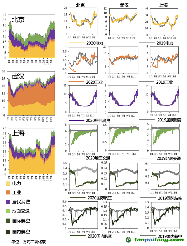 GRACED網(wǎng)格級高空間分辨率的數(shù)據(jù)展現(xiàn)形式可覆蓋包含全球重點(diǎn)城市在內(nèi)的關(guān)鍵排放區(qū)域,并量化表征分部門排放的時(shí)空動態(tài)特征。以北京、上海、武漢三座典型城市為例,2020 年 3 座城市的碳排放量在 1 月末受疫情影響出現(xiàn)明顯下降,在疫情得到控制后趨于平穩(wěn)。但即使受到疫情影響,2020 年三座城市的碳排放的主要來源依然是工業(yè)部門,從人為排放所反映的人類活動水平變化來看,居民消費(fèi)部門受疫情影響較小,地面交通和航空部門受疫情影響最為顯著。
