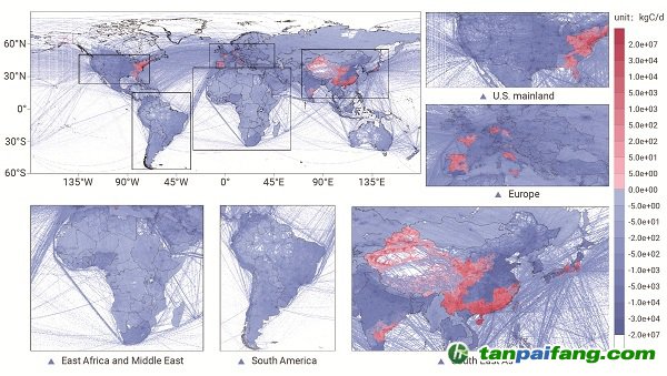 全球2020年碳排放日均分布圖 內(nèi)-容-來-自;中_國_碳_0排放¥交-易=網(wǎng) t an pa i fa ng . c om