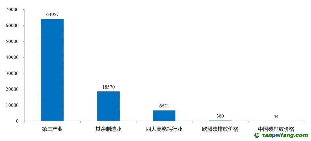 在我國的四大高耗能行業(yè)中,每一噸碳排放所能創(chuàng)造的增加值約為6671元;這一數(shù)字在其他制造業(yè)為18570元,在第三產(chǎn)業(yè)為64057元。其中,第三產(chǎn)業(yè)對電力需求的技術(shù)細(xì)節(jié)差異比較大,但高耗能行業(yè)和其他制造業(yè)則以電力為最重要的能量輸入渠道,對電力有著嚴(yán)重的依賴。